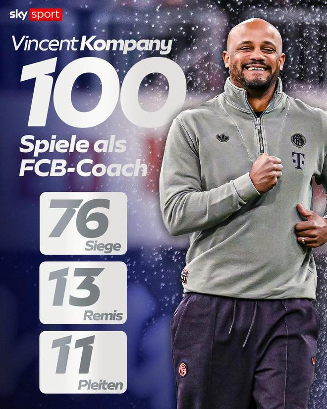 此役拜仁慕尼黑客场2-1击败皇家马德里后,孔帕尼带领球队100场比赛已取得76场胜利(13平11负)。